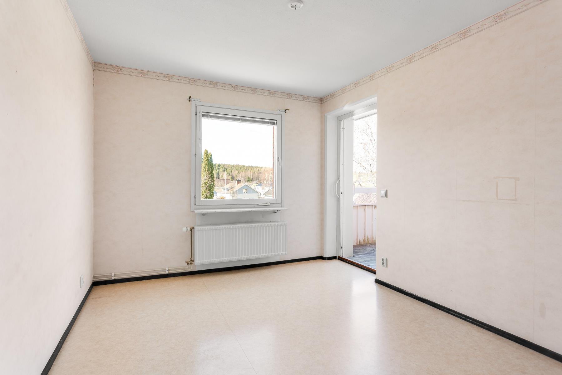 Trivsamt sovrum med plats för dubbelsäng. Väggarna är ljust tapetserade och på golvet ligger en plastmatta. Här finns även utgång till balkongen.