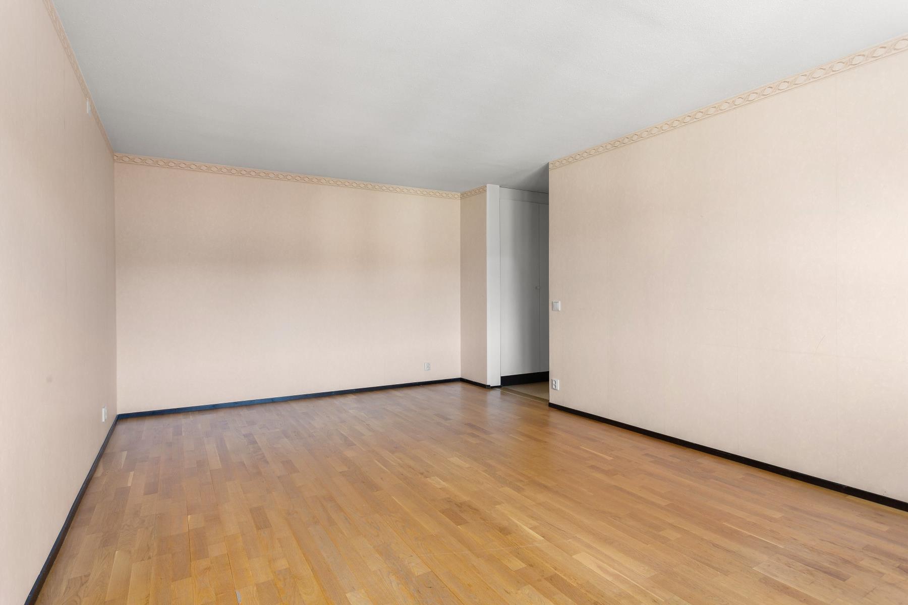 Till höger från hallen sett ligger det rymliga vardagsrummet med ljusa väggar och parkettgolv.