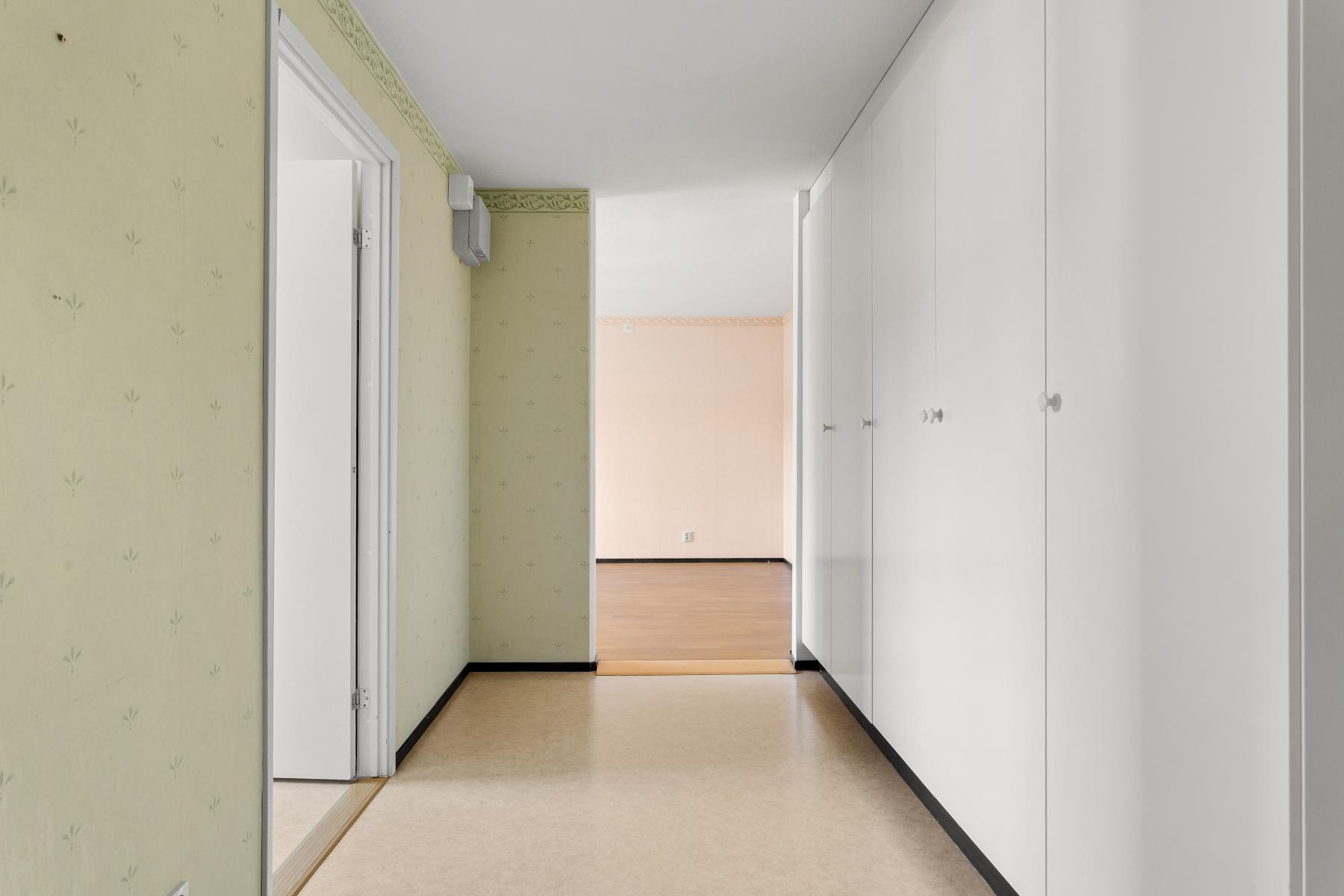 Välkommen in i hallen. Här finns plats för klädförvaring i fem garderober. Väggarna är ljust tapetserade och på golvet ligger en plastmatta.