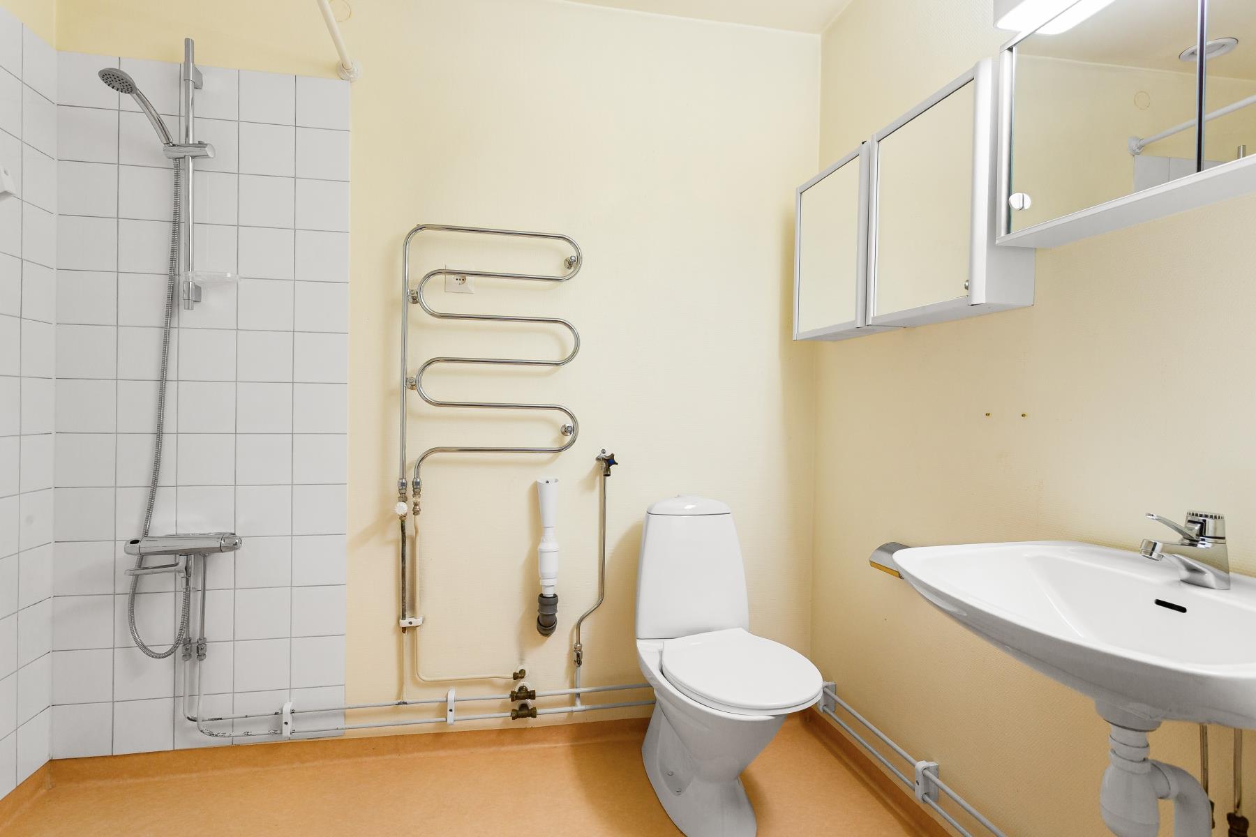 Badrum utrustat med wc-stol, kaklad dusch-hörna, handdukstork, tvättställ och spegelskåp. Våtrumstapet- och matta. Badrummet är förberett för tvättmaskin.
